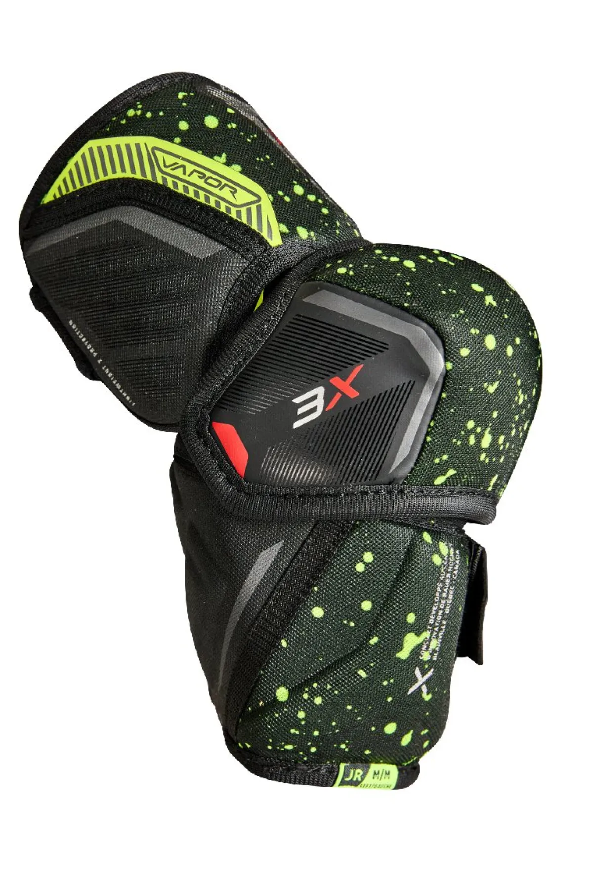 The New Vapor 3X Elbow Pad Has The Same 3-Piece Construction As The Hyperlite Top Pad. This Makes The Protection Feel Like Part Of You And Allows You To Move Unhindered On The Ice. Of Course, The 3X Is Also Designed To Keep Weight Down. Level: Competitive Size: Sr: M-L, Int: M-L, Jr: S-M Ebow: 3-Piece Construction Biceps: Free-Standing Movable Construction With Molded Pe Plates Lower Arm: 360-Degree With Anatomically Shaped Guard Braces