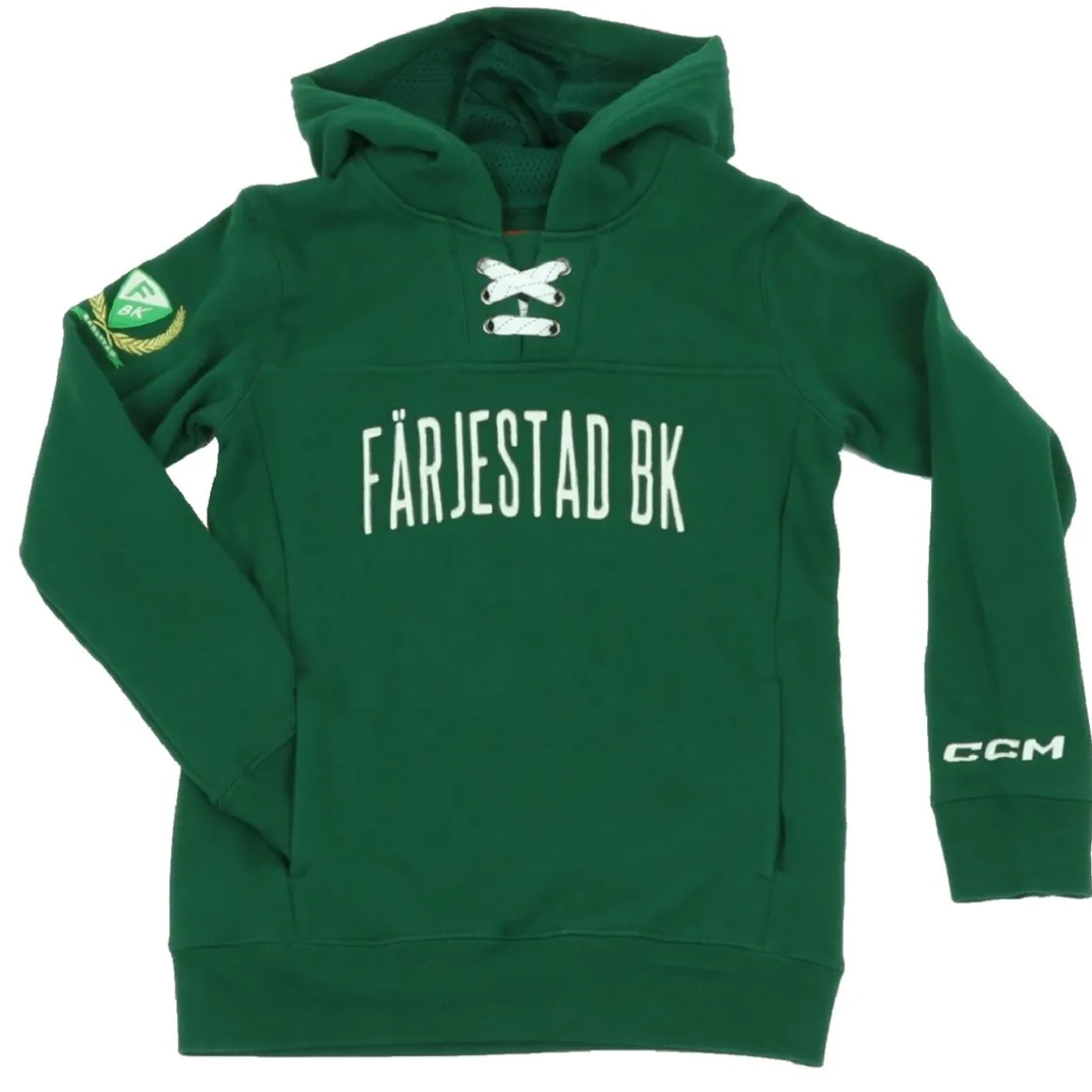Hoodie From Ccm In Unique Farjestad Bk Design. The Stick’s Green Colours With Farjestad Bk Text In White On The Chest. Fbk Logo On The Right Arm As An Extra Detail. Hockey Laces In The Collar Mouth. Junior Sizes.